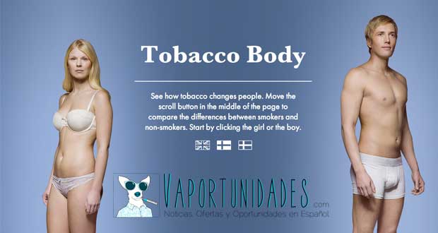 Se trata de una comparación interactiva de las consecuencias que tiene el tabaco sobre nuestro cuerpo, destacando el impacto que tiene en ciertos órganos específicos.