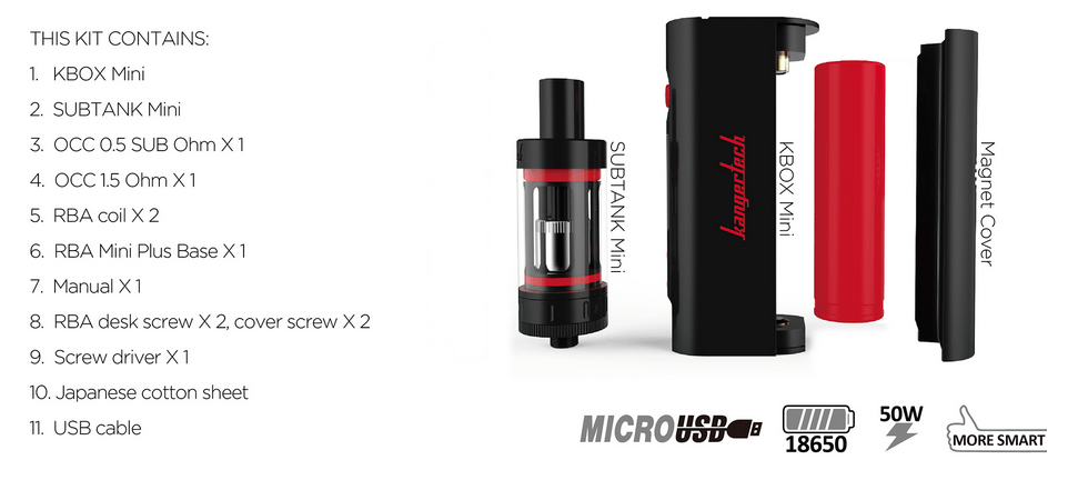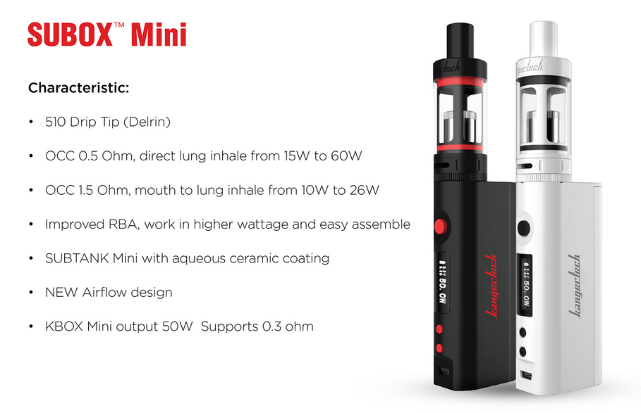 De esta manera nos presentan el Kanger Subox Mini, Un kit compuesto por un MOD electrónico de reducidas dimensiones capaz de entregar hasta 50W vatios de potencia alimentado por una batería 18650. Vendría a ser la evolución del Kbox, ahora con pantalla OLED y todas las características de seguridad que debemos esperar en este tipo de dispositivos.