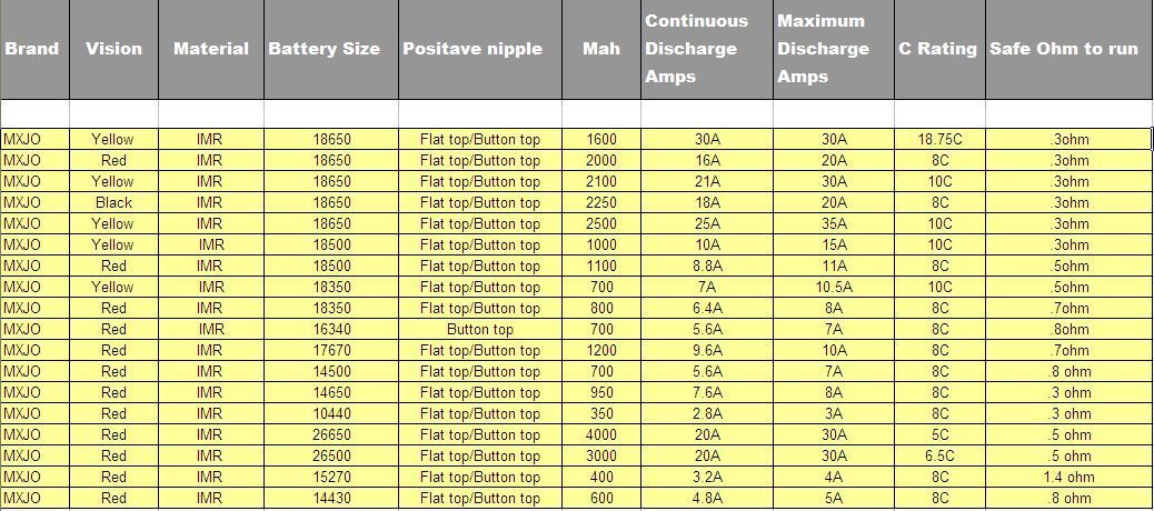 A continuación os dejo una tabla descriptiva con algunas de sus características y variedades. En ella veremos que tiene baterías para todo tipo de vapeadores, y son completamente compatibles incluso con técnicas de vapeo sub ohm, aportando el amperaje suficiente para no correr ningún riesgo.