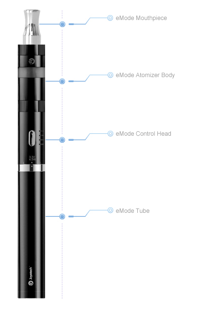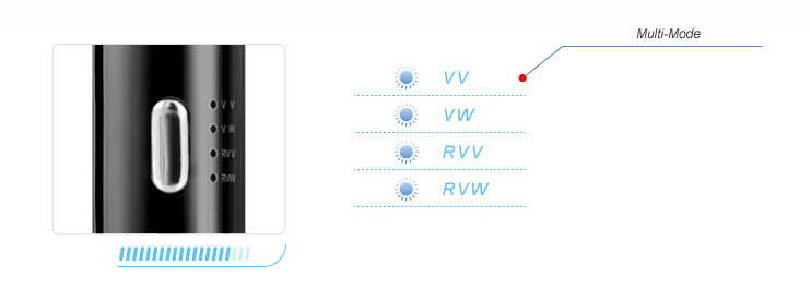 El eMode tiene 4 modos de uso: Se puede regulara tanto el voltaje como el vataje rotando el anillo de regulación 360 grados a través de su posicion VV Mode y VW Mode. Los otros dos modos permiten regular tanto los voltios como los vatios en tiempo real según vayas vapeando, acomodándose a tus hábitos de vapeo y optimizando el funcionamiento del eMode así como la duración de la batería.