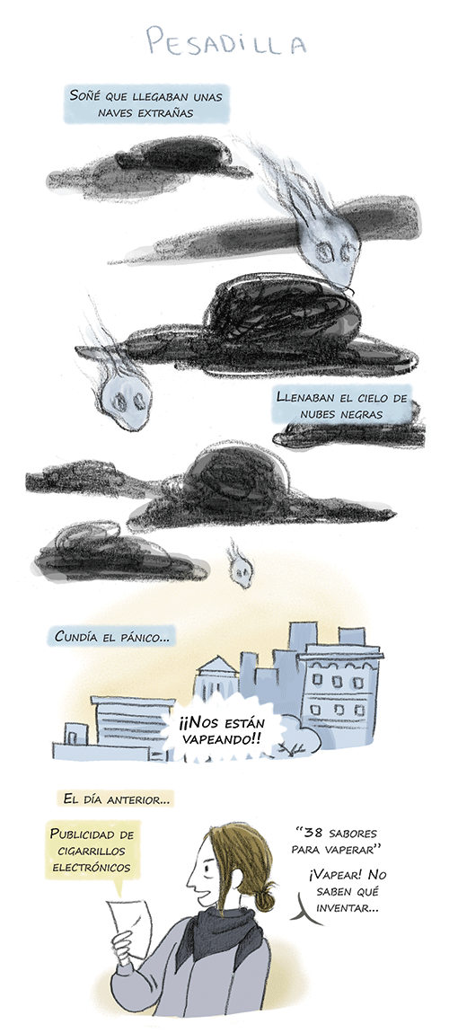 Primero por tratarse de una ilustración relacionada con el vapeo, segundo porque probablemente esta realizada por alguien quien no tiene mucha relación con los cigarrillos electrónicos, tercero por la gracia con la que orienta el anuncio y por último, por el nombre con el que titula la ilustración: Pesadilla…